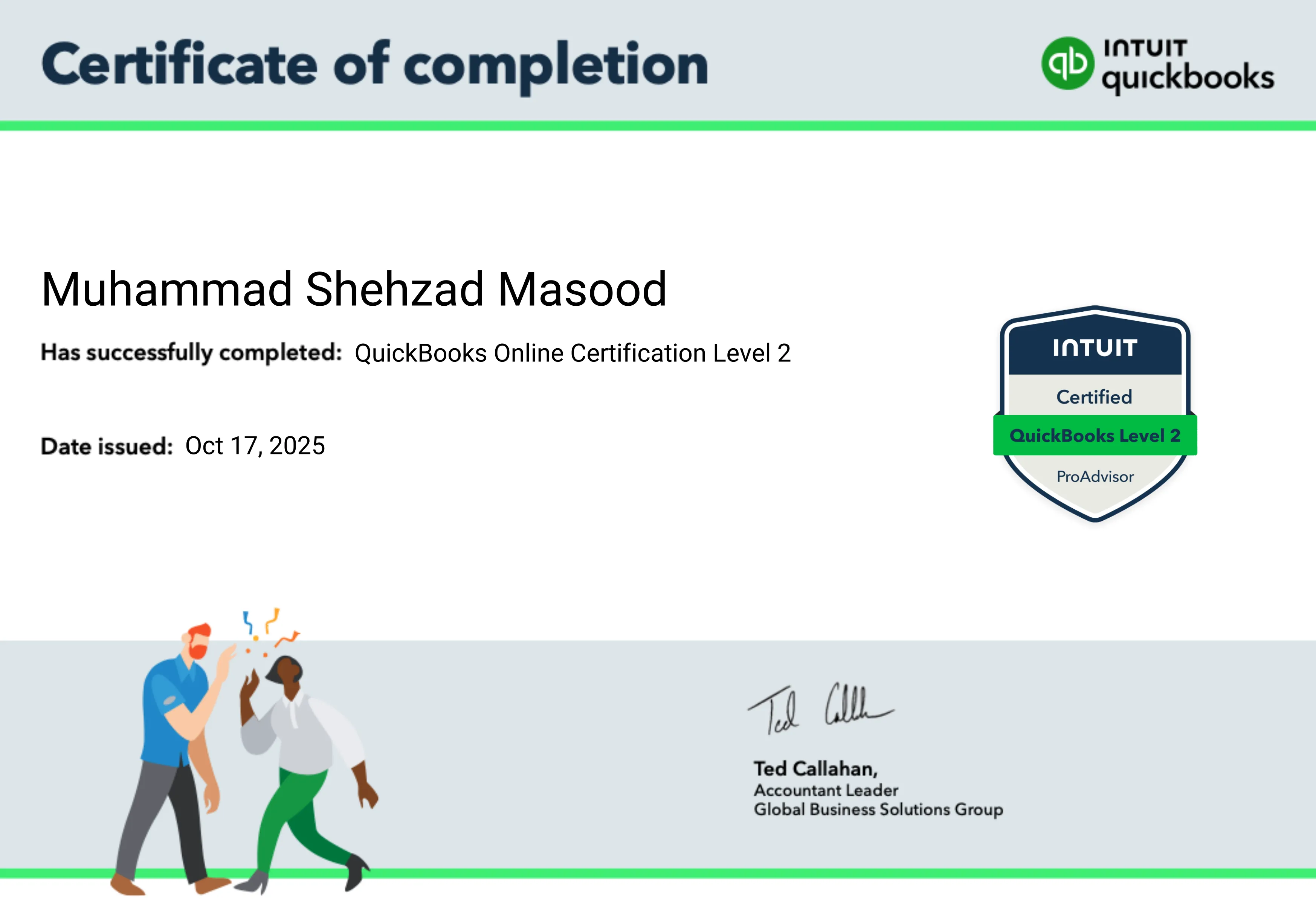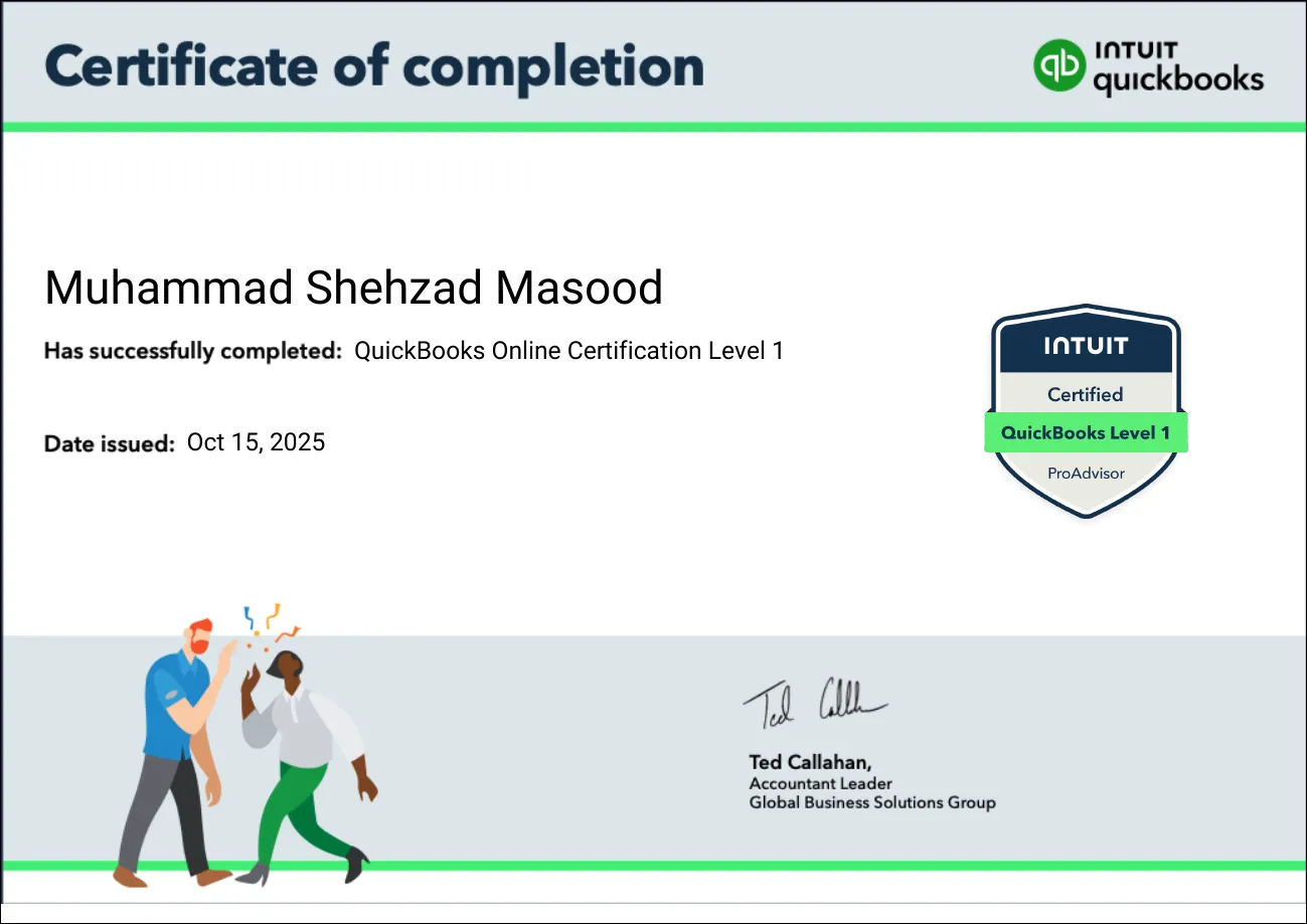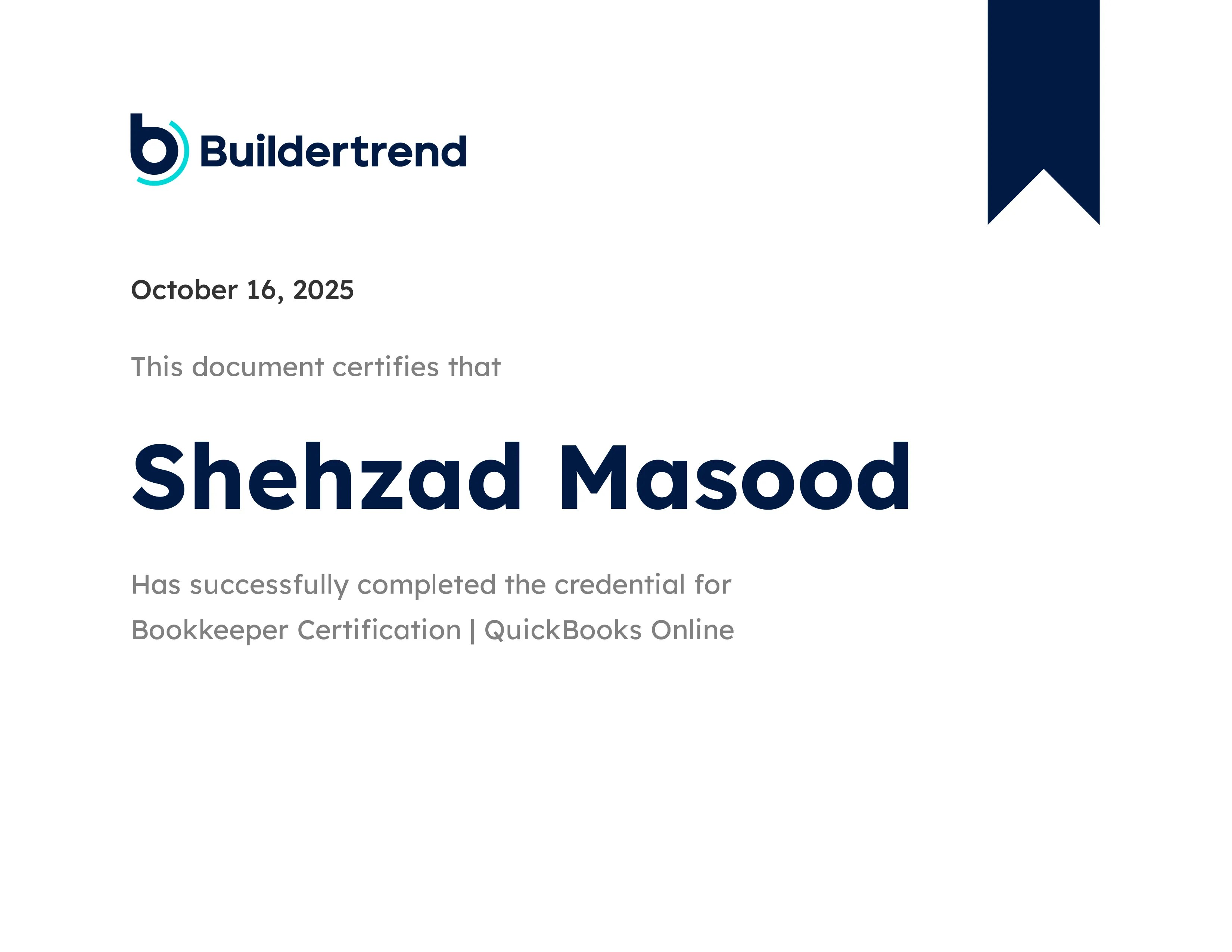 Mr. Shehzad Masood has done his Master in Commerce in 2006 and is an Affiliate Financial Accountant of Institute of Cost and Management Accountants of Pakistan (ICMAP). He has vast experience of 20 years in the field of accounting services covering activities of bookkeeping, bank reconciliations, account reconciliations, party account management, preparation of accounts, manage internal and external audits, taxation, etc. Mr. Shehzad Masood registered Meritorious Consultants; a partnership firm in 2007: providing accountancy services to the manufacturers, services providers, security agencies, individuals, partnership firms, etc. Meritorious Consultants was registered as LLC in Ohio – USA in September 2023 to cater for the business internationally. Mr. Shehzad Masood is certified QuickBooks online ProAdvisor, expert in tailor made accounting software, Peachtree/ Sage-50 Accounting, Xero, Bill.com, Expensify, Buildertrend, Housecall Pro, Hostaway, etc.