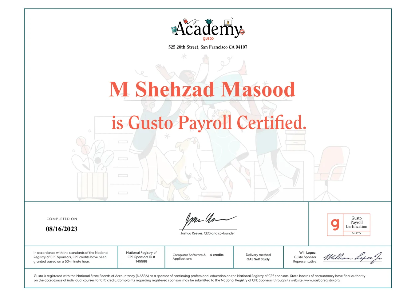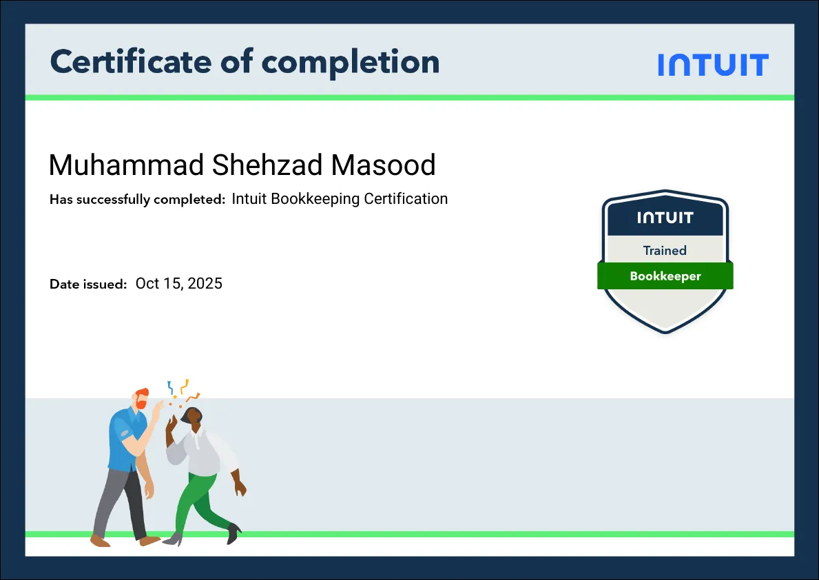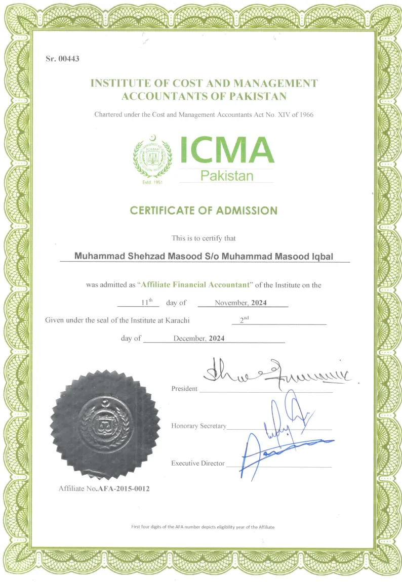 Mr. Shehzad Masood has done his Master in Commerce in 2006 and is an Affiliate Financial Accountant of Institute of Cost and Management Accountants of Pakistan (ICMAP). He has vast experience of 20 years in the field of accounting services covering activities of bookkeeping, bank reconciliations, account reconciliations, party account management, preparation of accounts, manage internal and external audits, taxation, etc. Mr. Shehzad Masood registered Meritorious Consultants; a partnership firm in 2007: providing accountancy services to the manufacturers, services providers, security agencies, individuals, partnership firms, etc. Meritorious Consultants was registered as LLC in Ohio – USA in September 2023 to cater for the business internationally. Mr. Shehzad Masood is certified QuickBooks online ProAdvisor, expert in tailor made accounting software, Peachtree/ Sage-50 Accounting, Xero, Bill.com, Expensify, Buildertrend, Housecall Pro, Hostaway, etc.